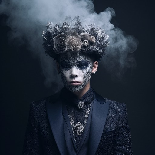 a loathsome young man, wearing a frightful Animal Skull with headdress, detailed close-up, in sophisticated black clothing, intricate details, dark colours, porcelain doll, complex makeup, grey black and blue puffs of smoke, studio lighting and volumetric lighting Photo taken by Chin Leong Teo, taken with a Canon EOS R with a Canon RF 35mm F1.8 MACRO IS STM lens at 1/200 sec, f/2.8 and ISO200, Award-winning photography style, 4k –v 5.1