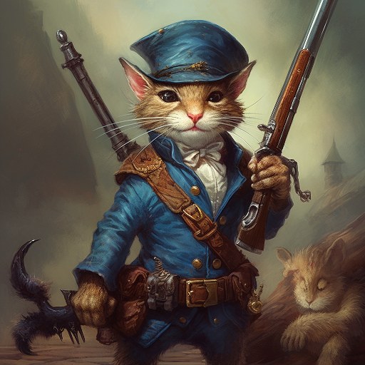 A cat in a hat with blue boots, carrying a sword and grinning as he walks confidently towards a mouse, who is armed with a rusty musket