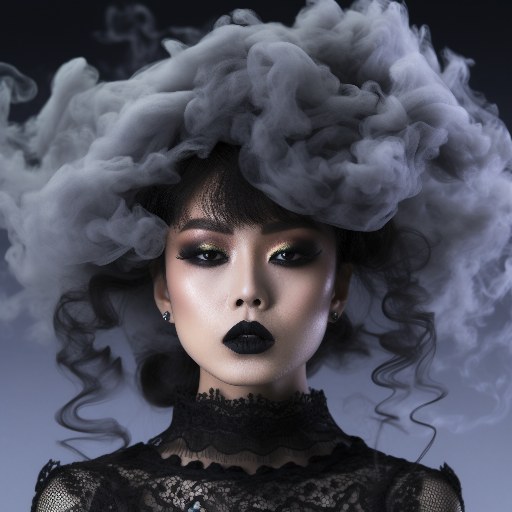 Beautiful woman, detailed close-up, dressed in black, mania and depression, waves of emotion, intricate details, dark colours, porcelain doll, extraordinary makeup, grey and black clouds of smoke, studio lighting and volumetric lighting Photo taken by Chin Leong Teo, taken with a Canon EOS R with a Canon RF 35mm F1.8 MACRO IS STM lens at 1/200 sec, f/2.8 and ISO200, Award-winning photography style, 4k –v 5.1