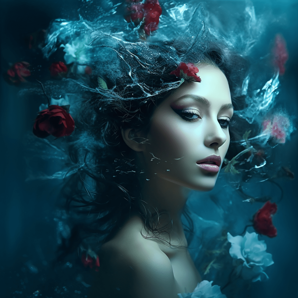 She had become the very personification of nature, her limbs were now made from tree branches and flowers, intertwined with foliage and blossom. She strode mightily through the water of the lake