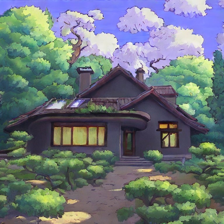 A contemporary house in the woods, anime, oil painting, high resolution, ghibli inspired, 4k