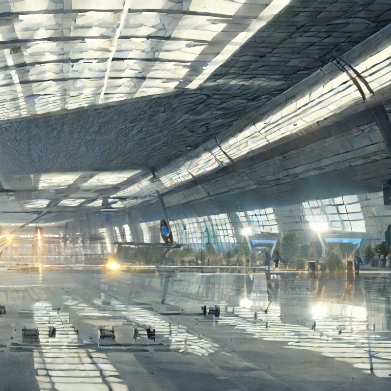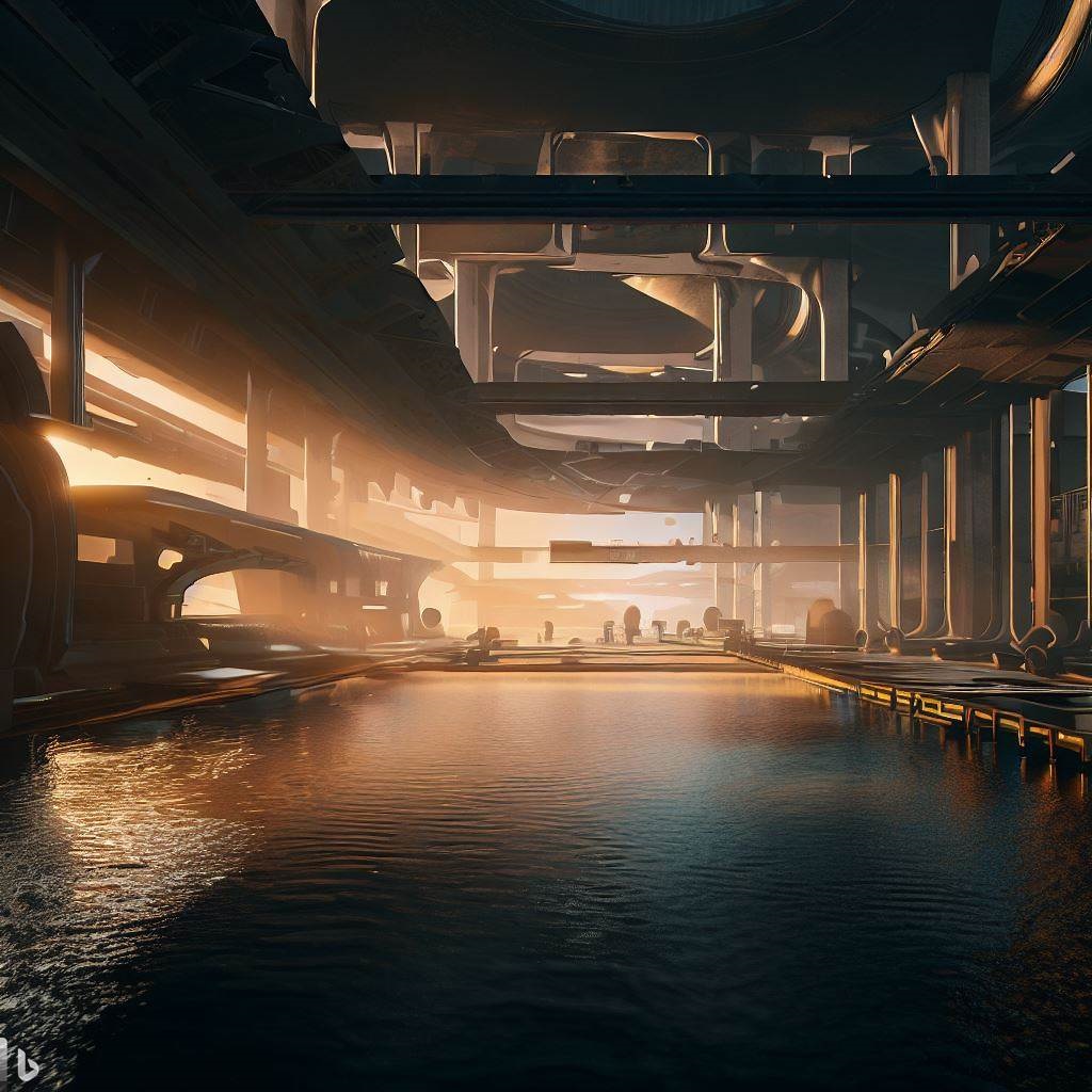 An airport with modern landscape architectural design for industrialpunk, water in the middle, dramatic lighting and composition, octane render, unreal engine 5