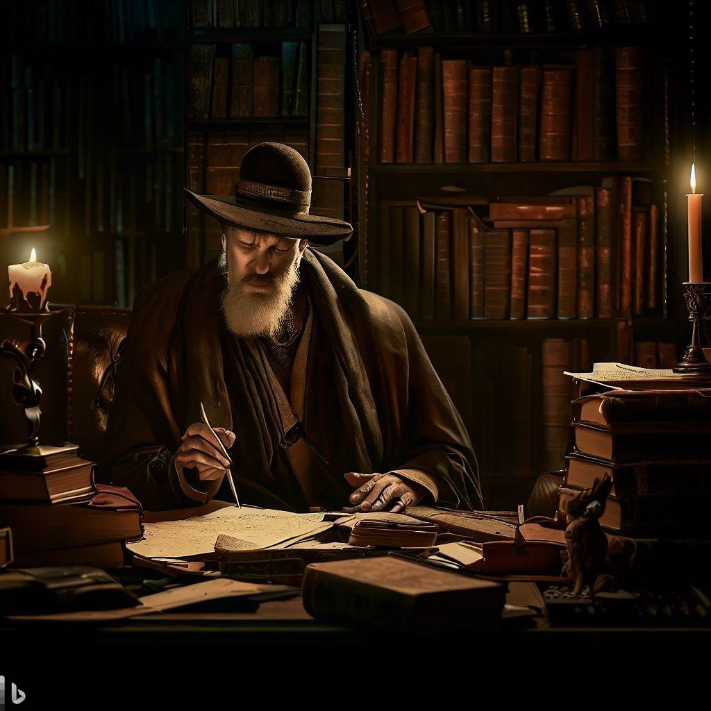 A scribe, copying an exotic spell from one spell book into another. Perhaps a cat or a small magical animal is looking on. The library is dark, with an ornate and expensive candle stick lighting the room. He is surrounded by books – both on high shelves and piled on the desk around them, some of the books laying opened on the table.