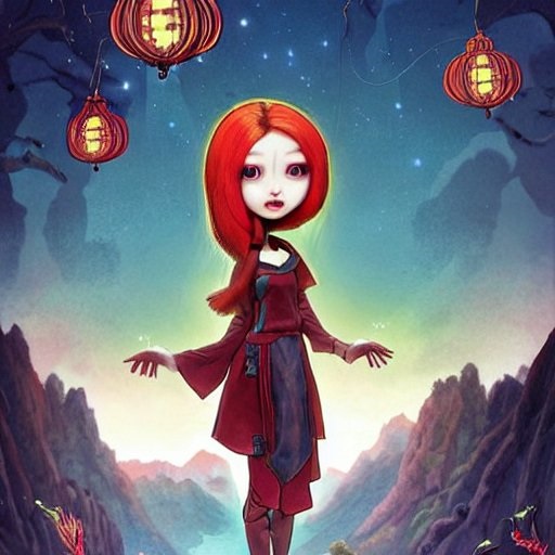 an epic fantasy comic book style full body portrait painting of a beautiful South Korean singer, long fire hair, cute, character design by Mark Ryden and Pixar and Hayao Miyazaki, unreal 5, standing on a majestic mountain range with a village below, with tiny glowing lanterns with a view of the ocean in the distance, at sunset, by David Noren, Jordan Grimmer, Tyler Edlin, featured on cgsociety