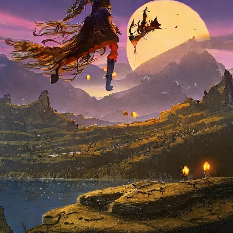I try: A beautiful photograph of a detailed witch on a broomstick flying over a majestic mountain range with a village below, with tiny glowing lanterns with a view of the ocean in the distance, at sunset, by David Noren, Jordan Grimmer, Tyler Edlin, featured on cgsociety and get these: